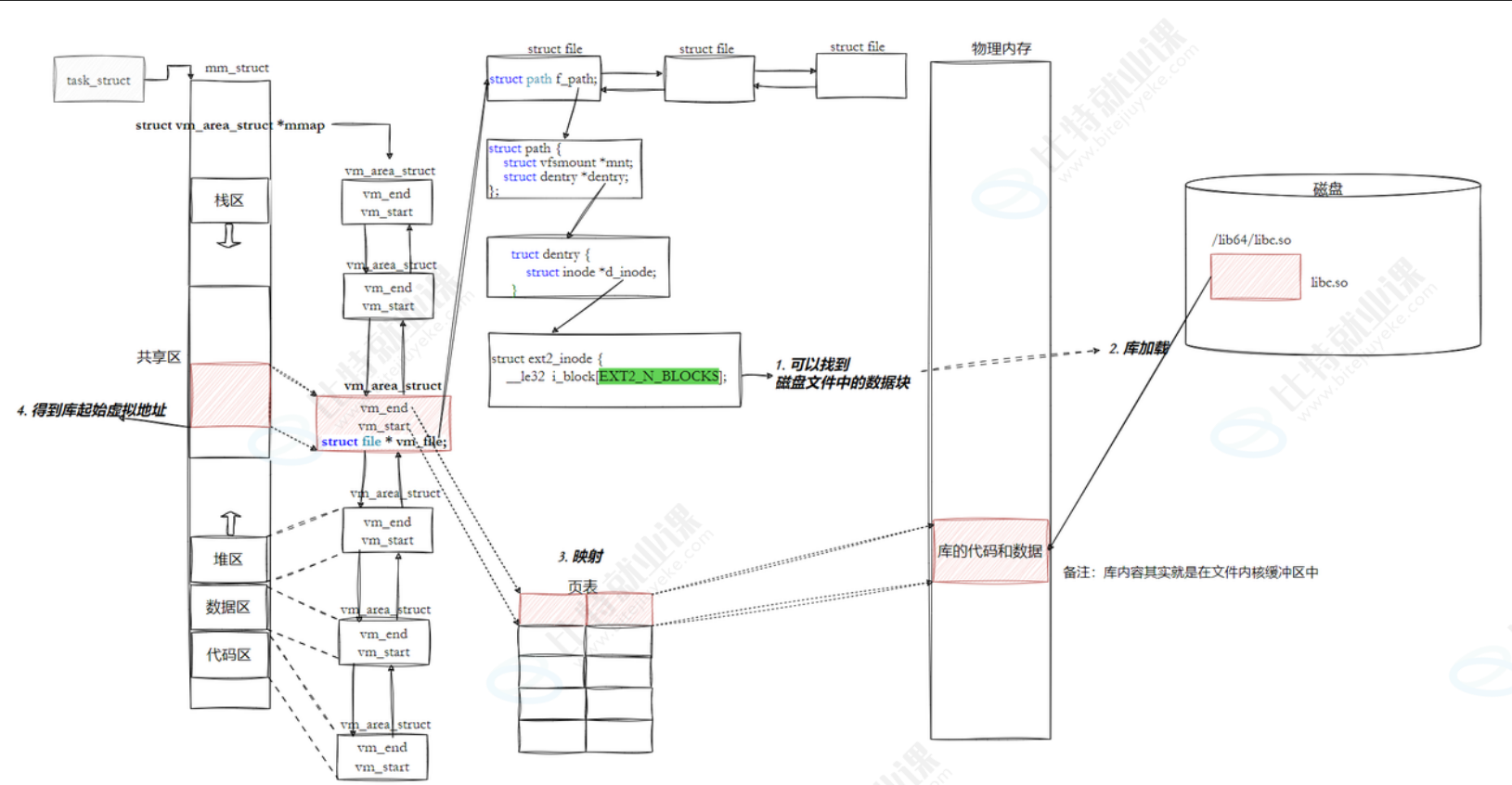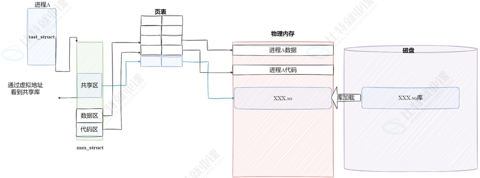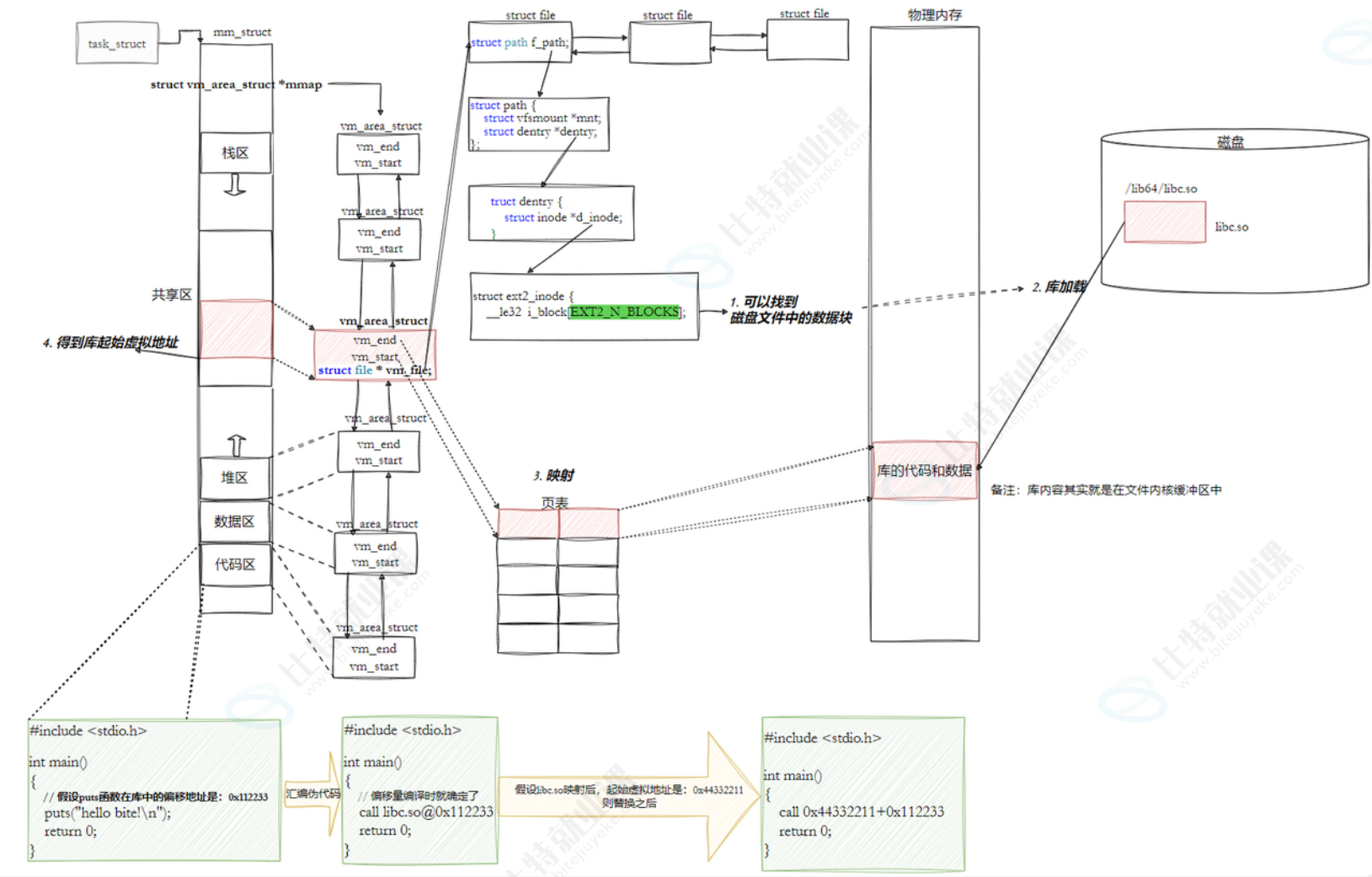 - 让我们的进程找到动态库的本质:也是文件操作,不过我们访问库函数,通过虚拟地址进行跳转访问的,所以需要把动态库映射到进程的地址空间中。