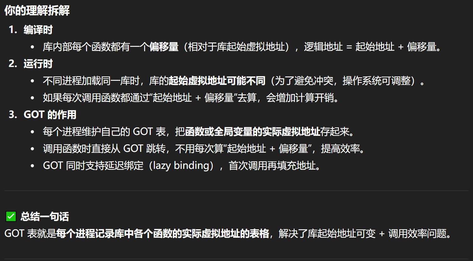 由于代码段只读,我们不能直接修改代码段。但有了 GOT 表,代码便可以被所有进程共享。但在不同进程的地址空间中,各动态库的绝对地址、相对位置都不同。反映到 GOT 表上,就是每个进程的每个动态库都有独立的 GOT 表,所以进程间不能共享 GOT 表。