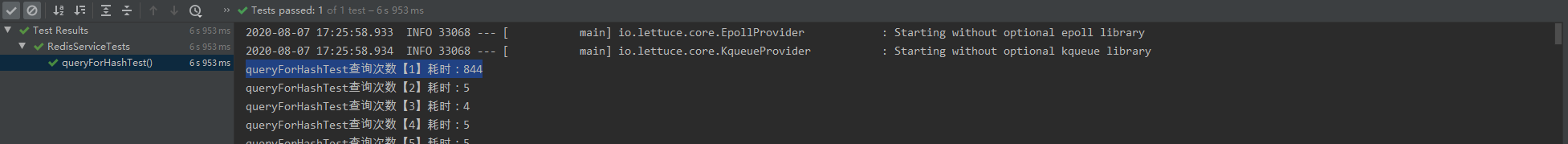 (4)需要注意的是,在第一次执行查询的时候,耗时都比较久,初步判断是由于从Redis连接池获取连接的影响