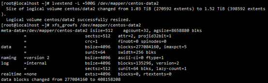 4.进行物理扩容:lvextend -L +500G /dev/mapper/centos-data2 ,系统还不认识刚刚添加进来的磁盘的文件系统,所以还需要对文件系统进行扩容,执行命令:xfs_growfs /dev/mapper/centos-data2