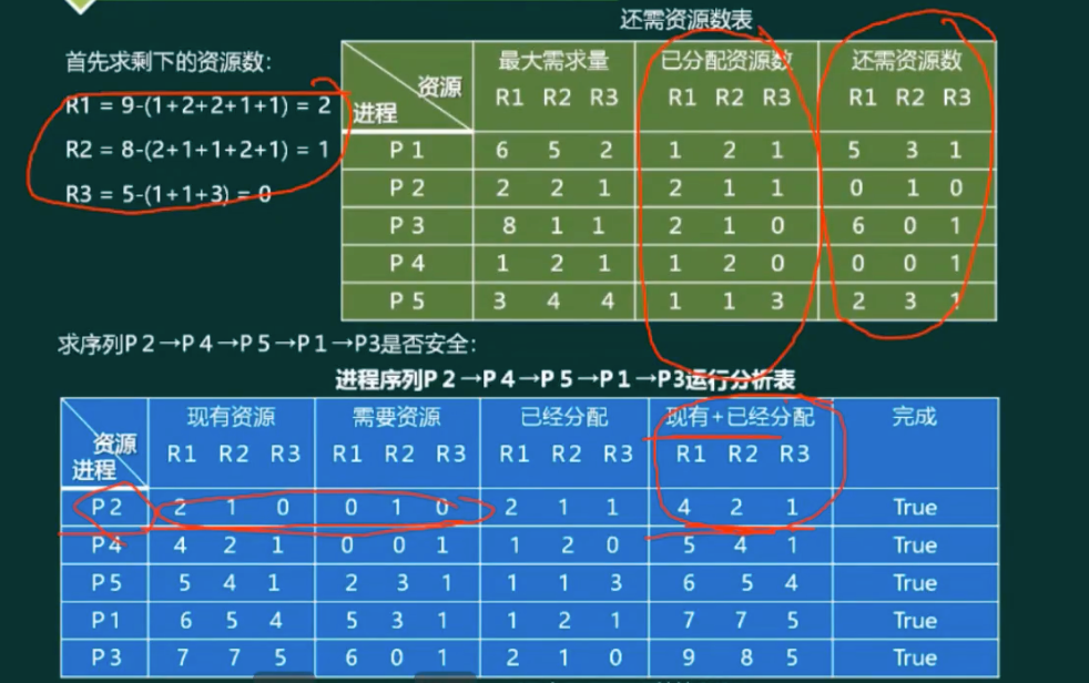 - 安全状态是指模拟资源分配时发现资源至少能使一个进程能执行下去(执行完就会释放使用资源,随着执行完的进程越来越多,系统可以分配的资源也会变多),使得系统能按照顺序分配资源给各个进程。从而避免了死锁的情况