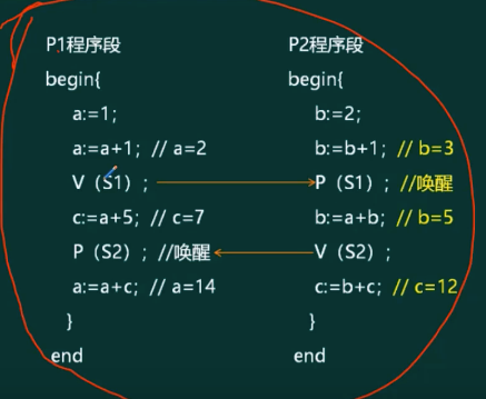 - 同时p2进程中测试p(s1)时发现s1=s1-1=0-1无法继续执行就阻塞,当p1进程中的v(s1)释放了s1资源使s1=s1+1=1后,这时p2进程中测试p(s1)s1=s1-1=0被唤醒继续往下执行,然后顺利v(s2)释放了s2资源使s2=s2+1=1