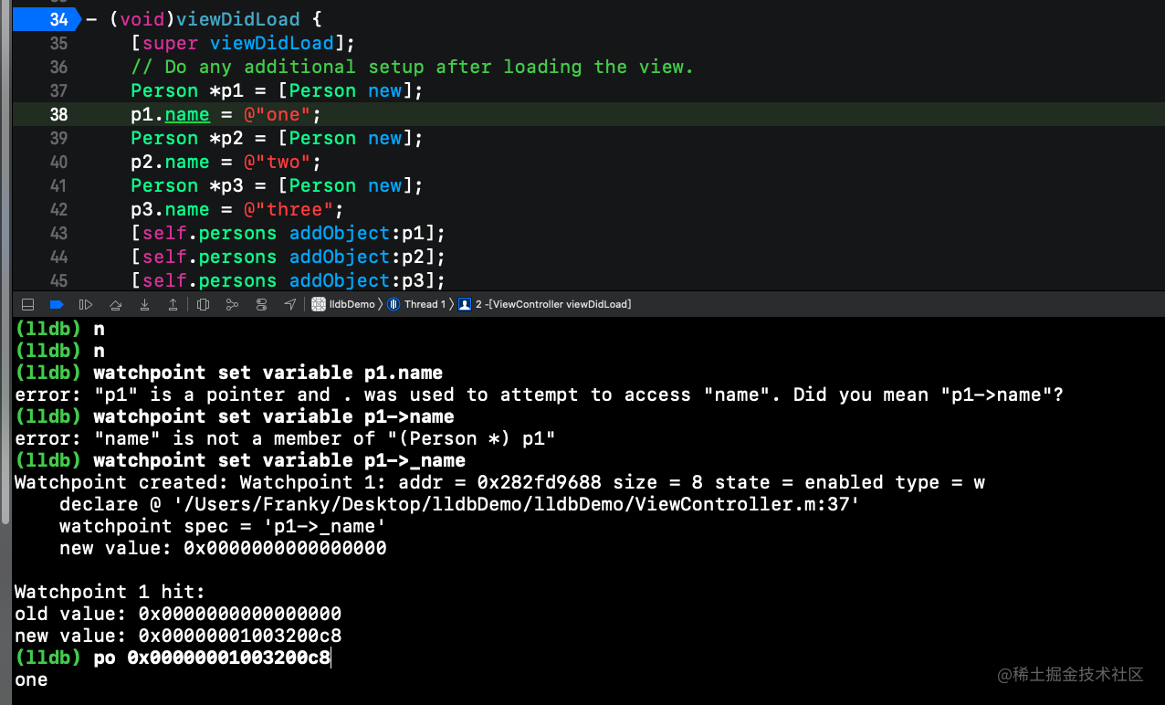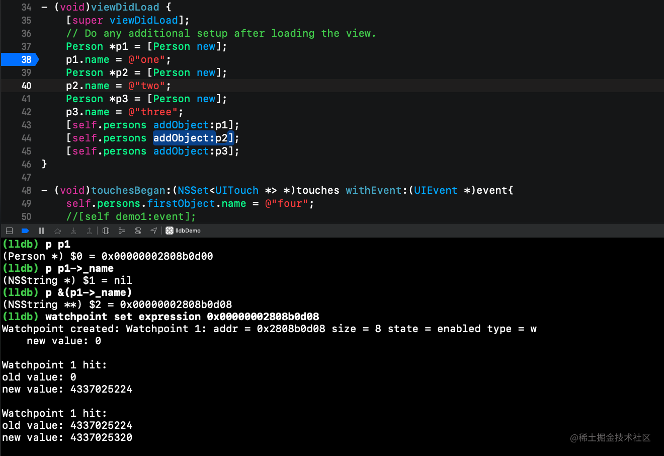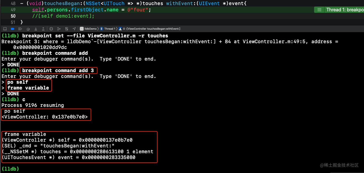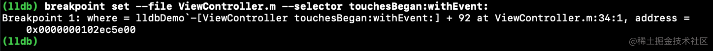 <img src="https://p3-juejin.byteimg.com/tos-cn-i-k3u1fbpfcp/c1df1a8fc0824a1eb514cbc346414faf~tplv-k3u1fbpfcp-zoom-in-crop-mark:4536:0:0:0.image) 在touchedBegan方法中,我们从界面设置了一个断点,进入了lldb调试模式,再输入以下命令设置函数断点:breakpoint set -n "test1",-n是--name的缩写,然后点击继续按钮,或者输入lldb命令c继续执行,可以看到其实Xcode集成的很多的调试功能就是从lldb这来的。调试下一步就在lldb输入n或者s,n遇到子函数不会进入,s遇到子函数会进入" style="margin: auto" />
