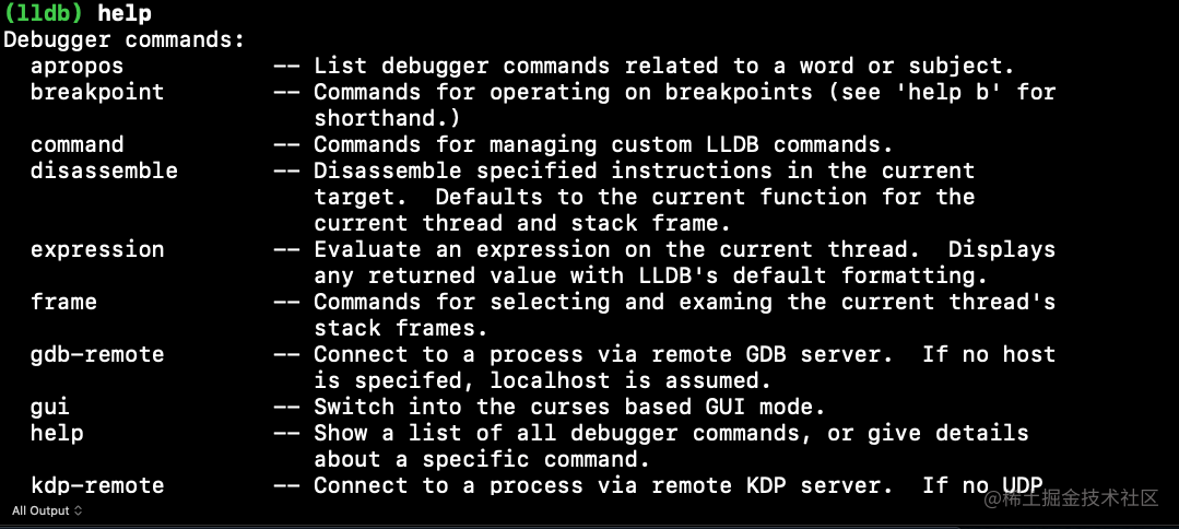 LLDB支持调试C、Objective-C和C++编写的程序。Swift社区维护了一个版本,增加了对该语言的支持。默认内置于Xcode中,LLDB提供了一组广泛的命令,旨在与老版本的GDB命令兼容。除了使用标准配置以外,还可以很容易的自定义LLDB命令以满足实际需要。可以在Xcode的控制器进入lldb调试模式后,输入help可以查看所有Debugger commands,也可以在这个网站查询