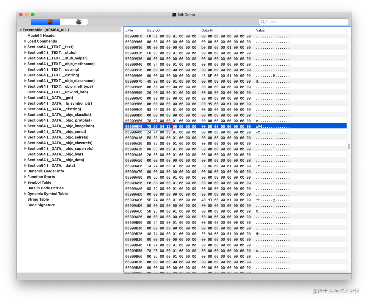 KVC还是牛逼啊,还有一种办法,我们知道UIView真正用来显示的是它的layer,修改layer:p self.view.layer.backgroundColor = [UIColor yellowColor].CGColor  0x102b959f0 - 0x102b8c000 = 0x99F0在使用MachOView查看我们APP的Mach-O文件,找到地址0x99F0,看看是不是这个a的值0x123456678