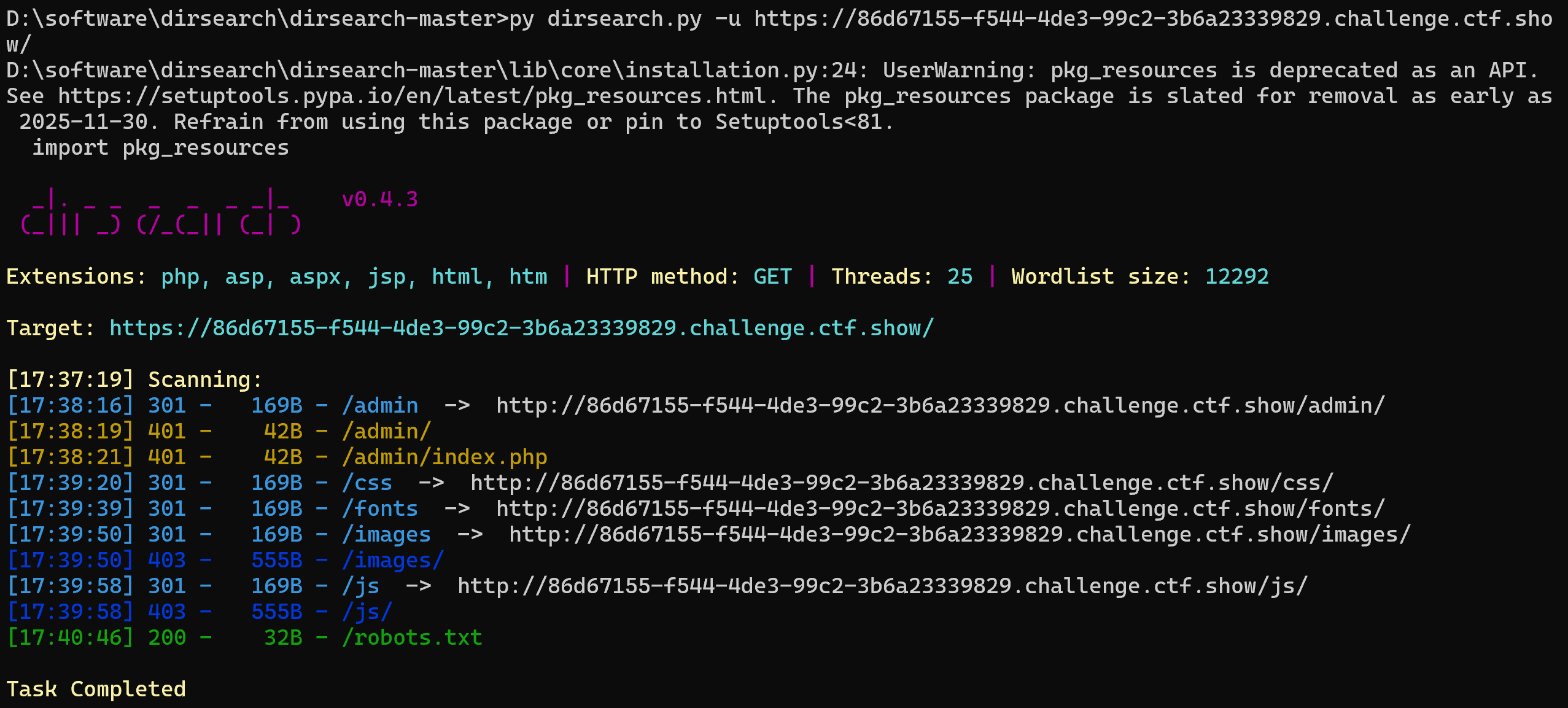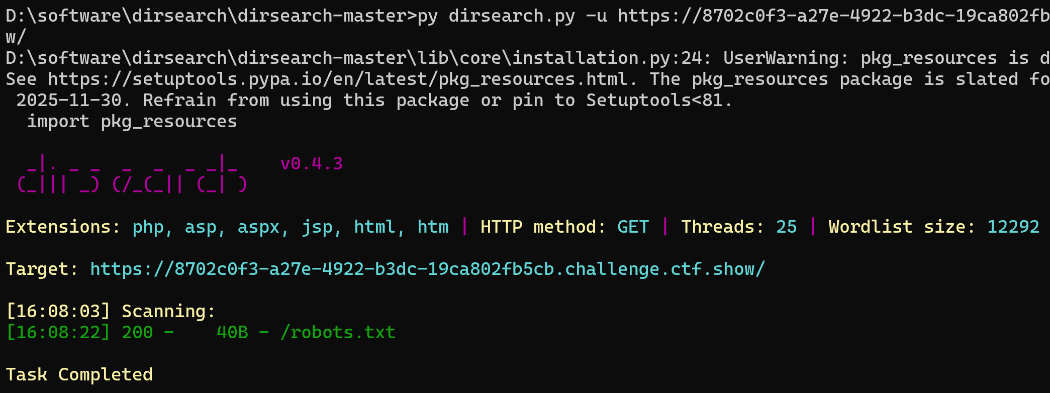 如果没想到访问robots.txt,可以用dirsearch扫描来获取线索: