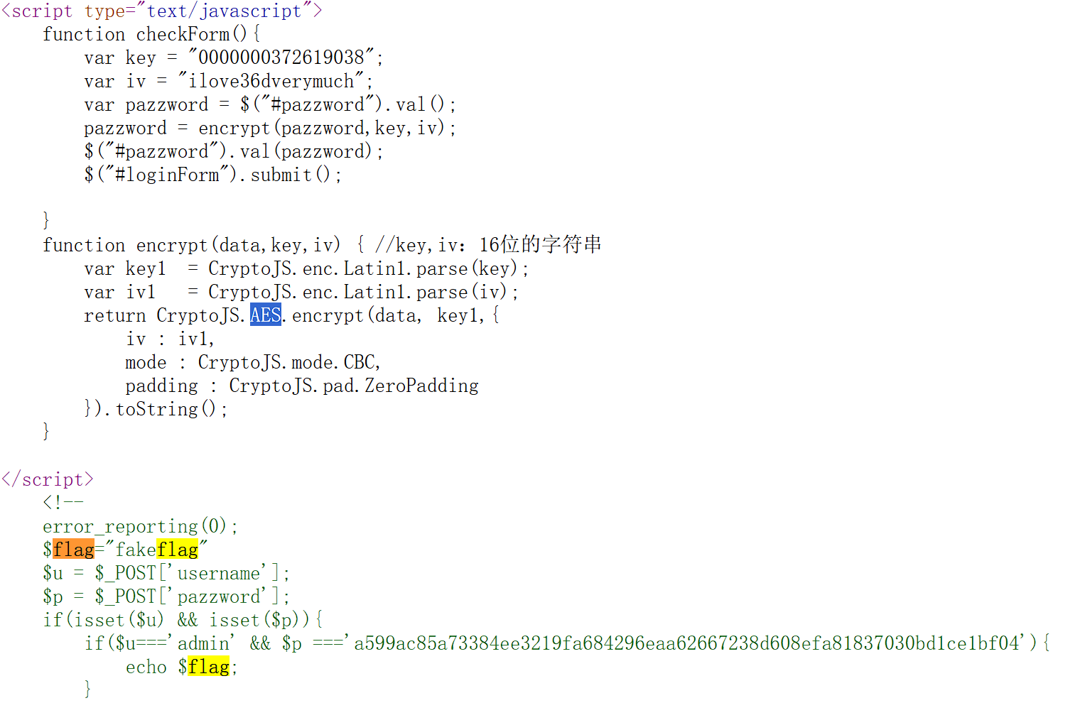 可以看到,password在前端进行了加密,使用的加密方法是AES-CBC,加密之后的值是a599ac85a73384ee3219fa684296eaa62667238d608efa81837030bd1ce1bf04,密钥是。因此我们解密这个字符串,解密之后就是前端需要输入的密码: