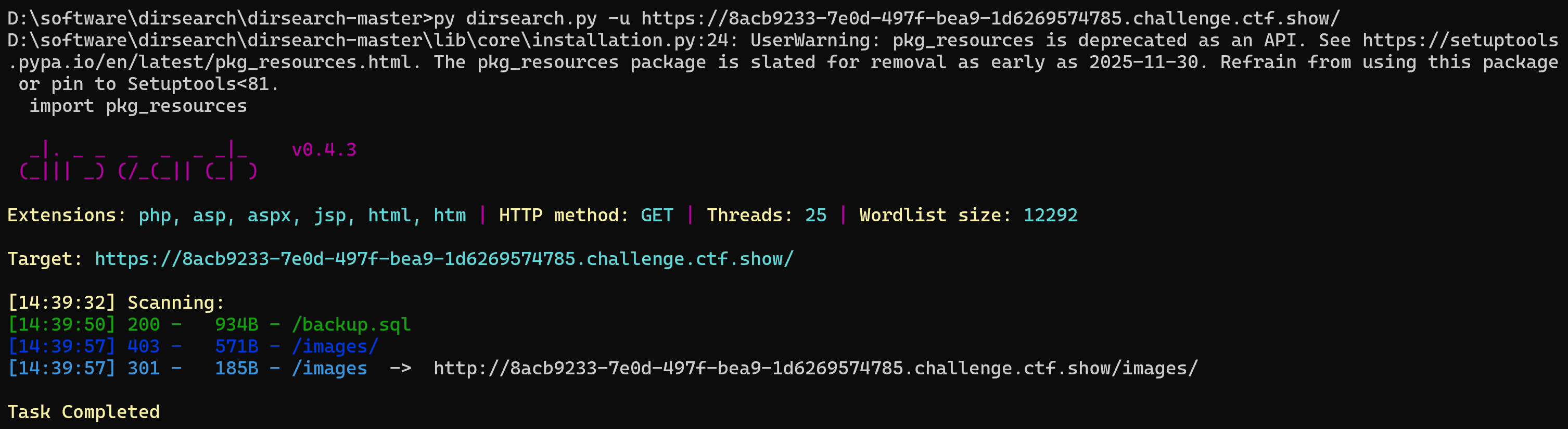 sql的备份文件一般在backup.sql。不知道也没事,dirsearch可以扫描出来。