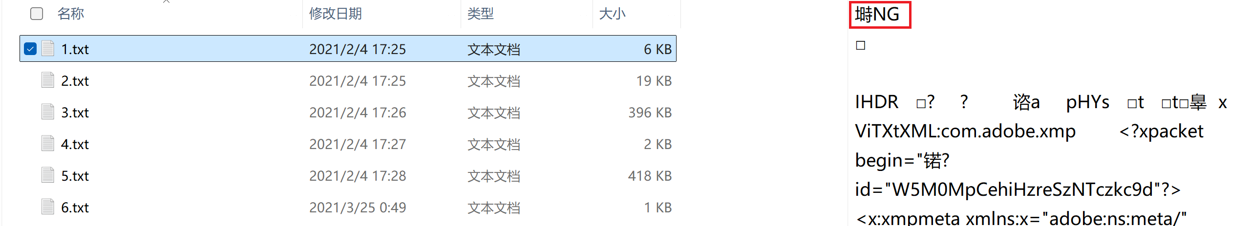 解压后得到6个txt文件,分别查看内容,发现都是图片格式。