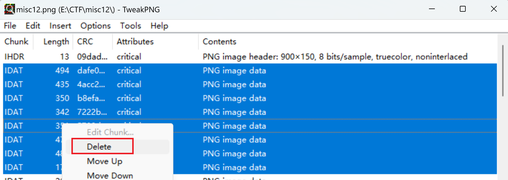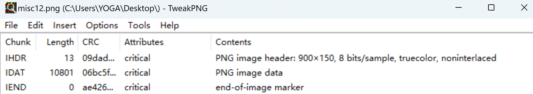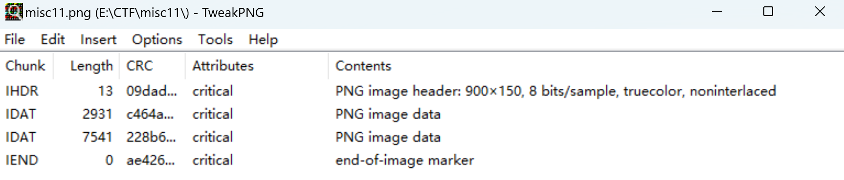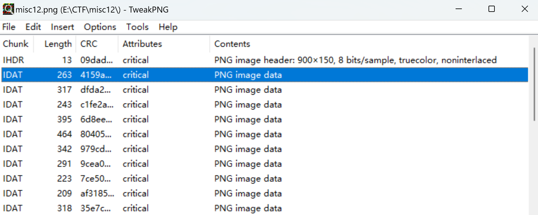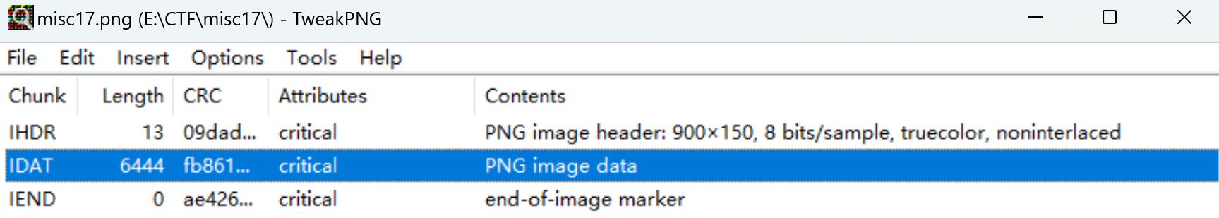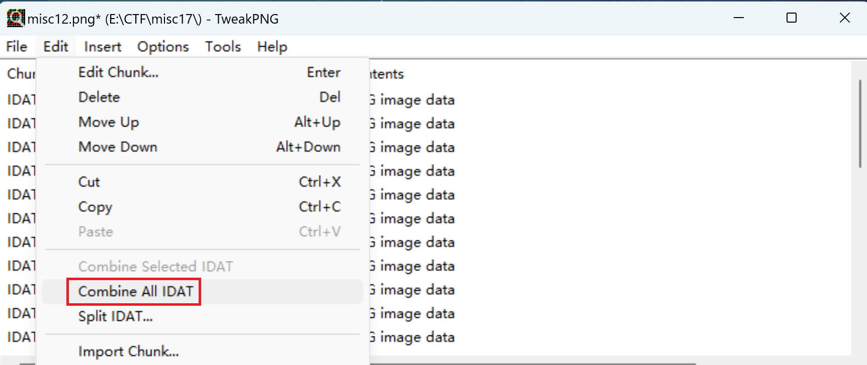 无论时直接查看,还是使用binwalk分离都没有信息。还是用tweakpng。发现有多个数据块,edit-combine all idat合并所有数据块: