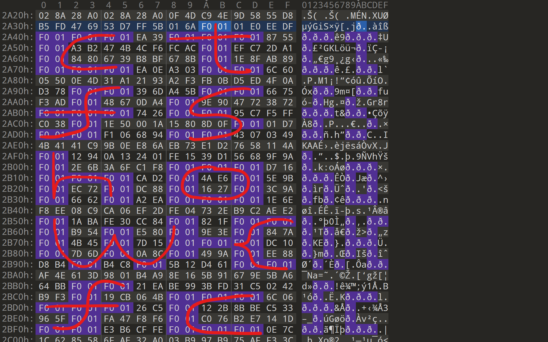 用010editor打开。发现有很多F001,搜索F001,发现它们的形状就是flag: