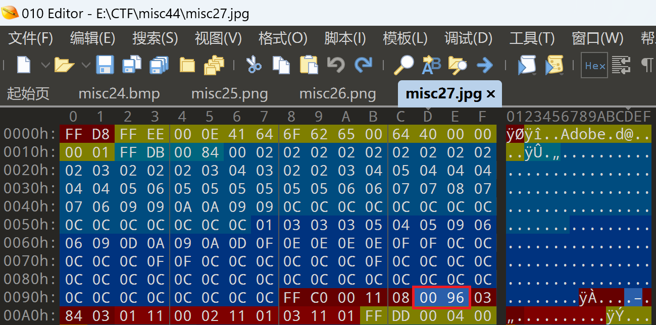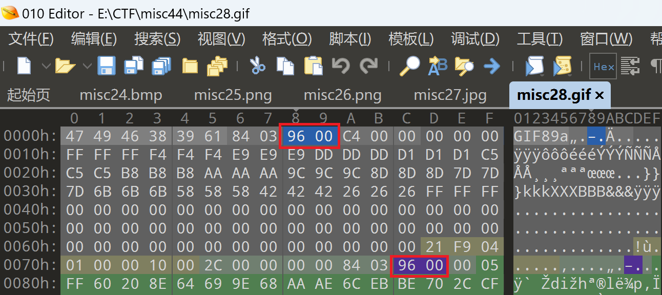 同样的,用010editor打开,搜索00 96,这时发现搜不到了。查了资料发现,原来gif格式是小端序,因此应该是96 00。