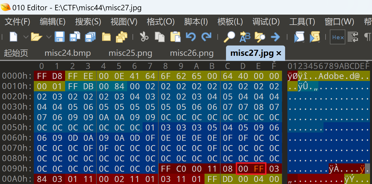和刚才的宽高一样,我们直接把高度修改的大一点即可。(从00 96变成00 FF,这个数值可以自己任意调整,直到图片中能看到flag,当然不要直接改成FF FF,这样可能加载失败)