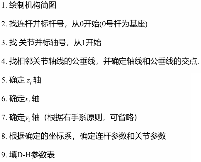 对于一个机器人将连杆参数形成一个D-H参数表的过程,其实就是将上面讲到的四个参数列写出来。步骤主要是: