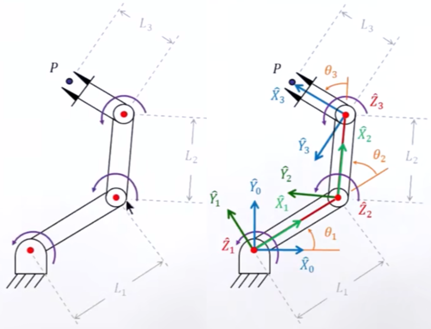 b. 建立坐标系,如上右图,首先在基座建立Z轴向外,X轴水平的坐标系;其次1号系也建立在基座与杆1的旋转关节处,Z冲外,X沿着杆方向;2、3杆也是一样道理建立坐标系。