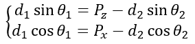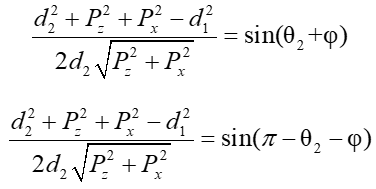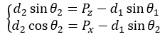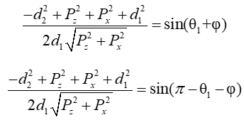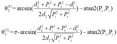 theata1_2=pi-asin((-(d2)^2+(d1)^2+(px)^2+(pz)^2)/2/d1/sqrt((px)^2+(pz)^2))-atan2(px,pz);