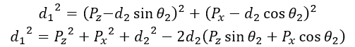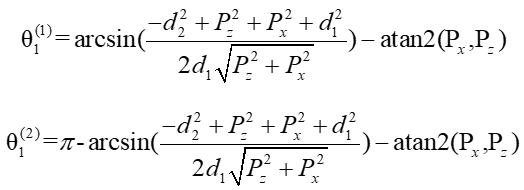 theata1_1=asin((-(d2)^2+(d1)^2+(px)^2+(pz)^2)/2/d1/sqrt((px)^2+(pz)^2))-atan2(px,pz);