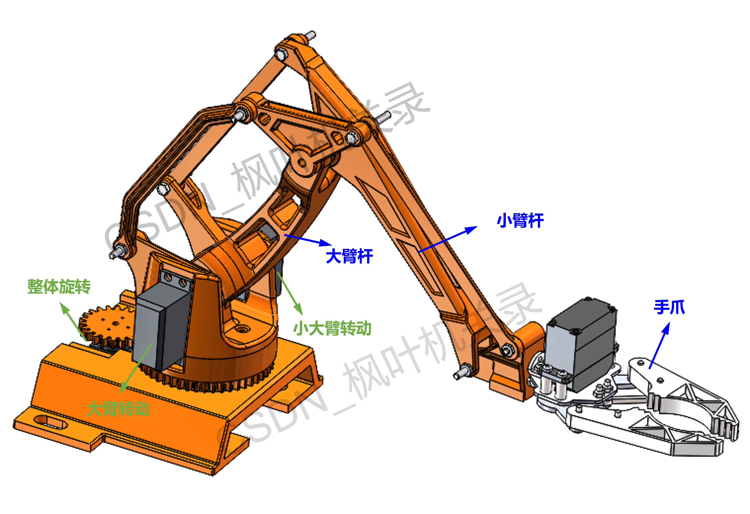 三自由度是指下面齿轮传动的一个转动自由度,以及大臂小臂的两个自由度,图中都是用舵机驱动的。末端是一个单自由度的夹爪,也是依靠舵机驱动的。
