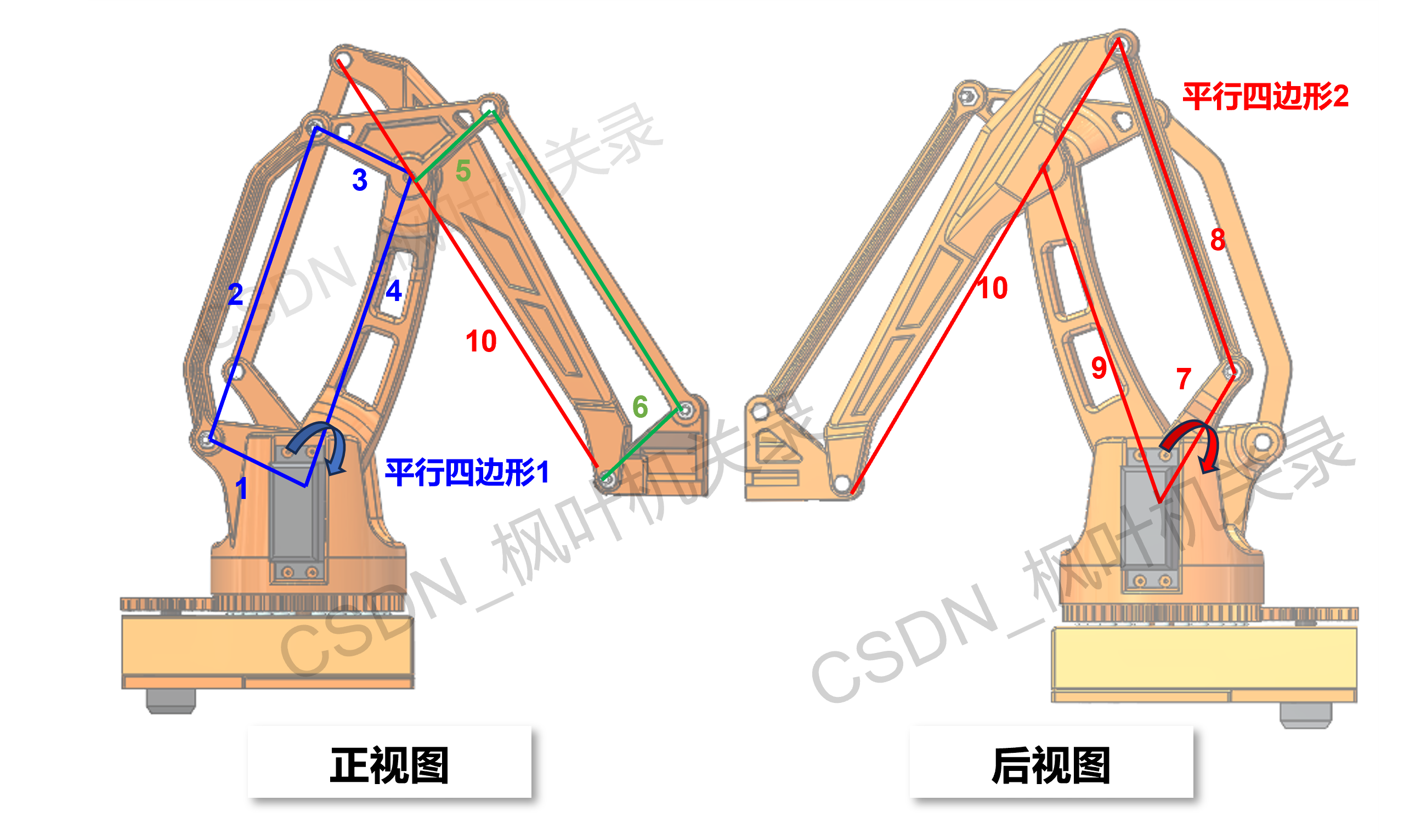 实际上平行四边形1结构,主要是为了引导末端的夹爪保持水平。当大臂杆4转动时,会带动平行四边形1中与大臂对应的连杆2转动。需要注意的是这个平行四边形中杆1是固定不动的,所以无论大臂如何运动,上面三角形连接块的边3也不会转动(只会跟着平动)。
