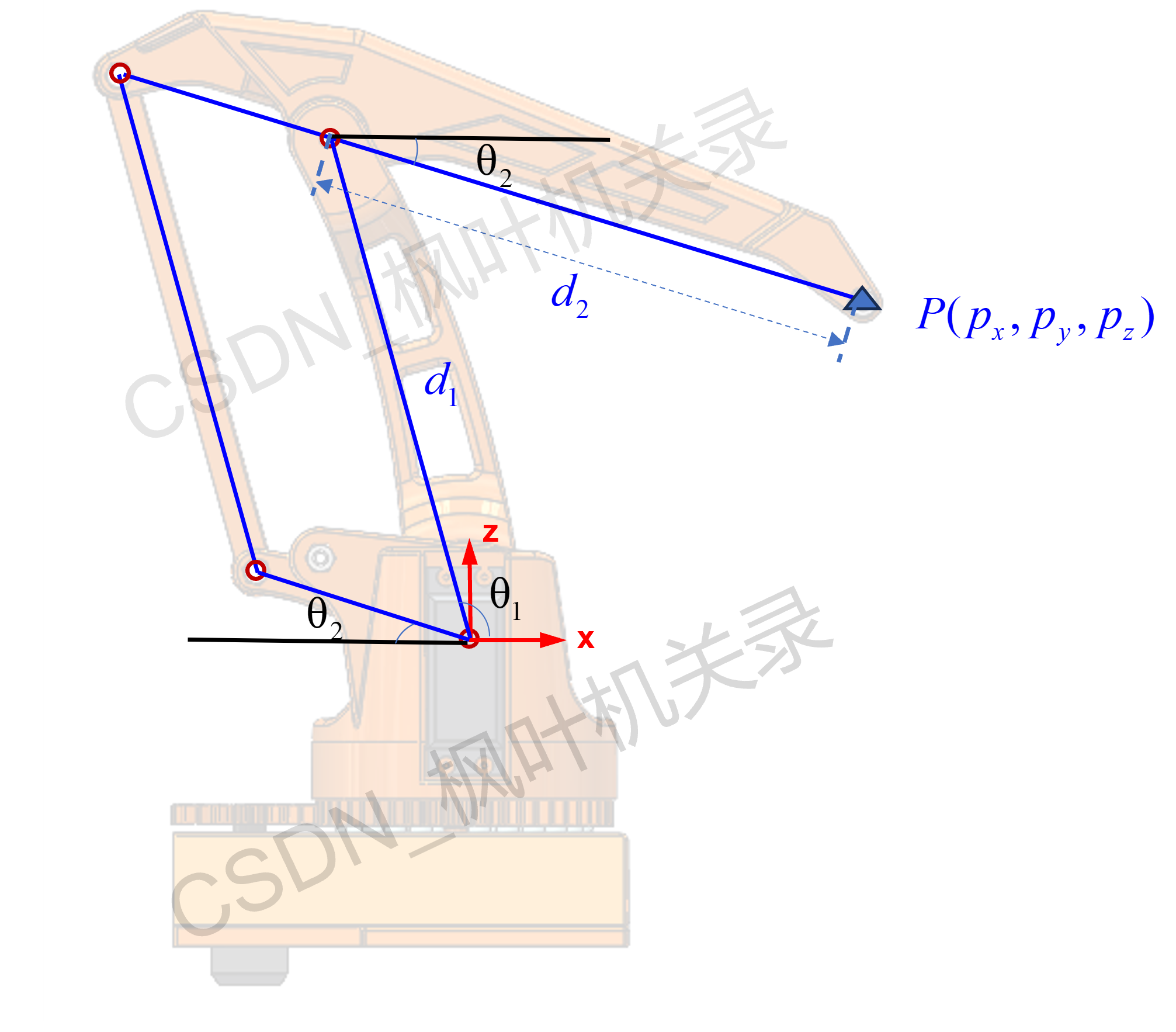 ① 通过几何法,先不考虑底座的转角,先考虑机械臂在这一xz平面的位姿。这样可以写出末端点P相对于基座标系得表达式: