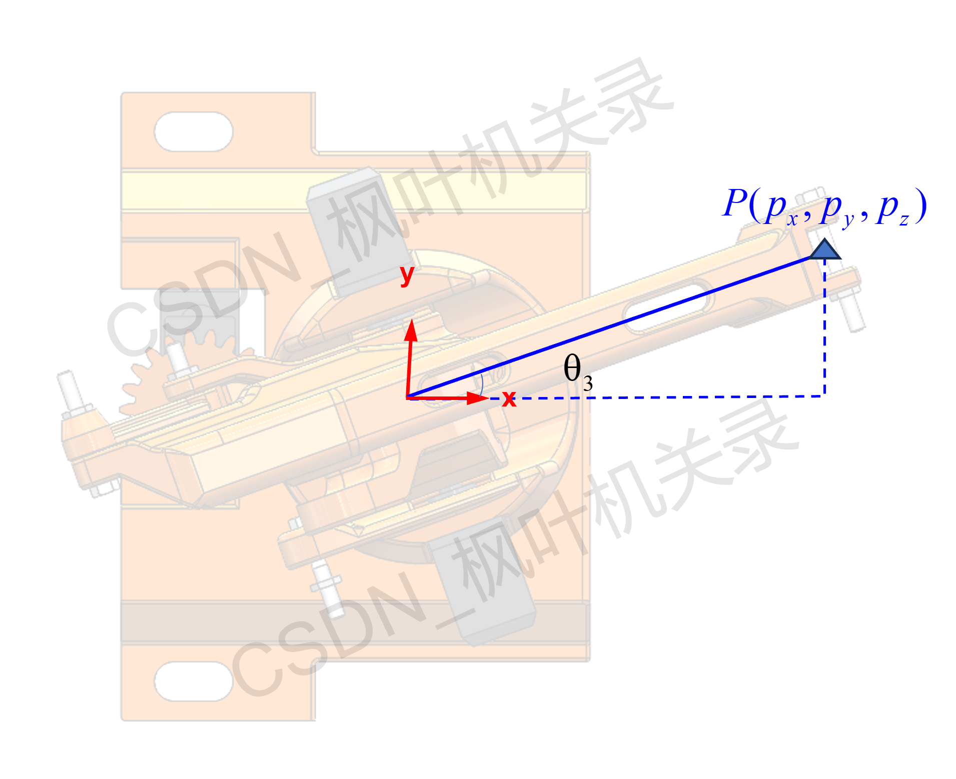 ② 然后再看底座转角与位姿的关系,如下图所示并建立如下的关系式: