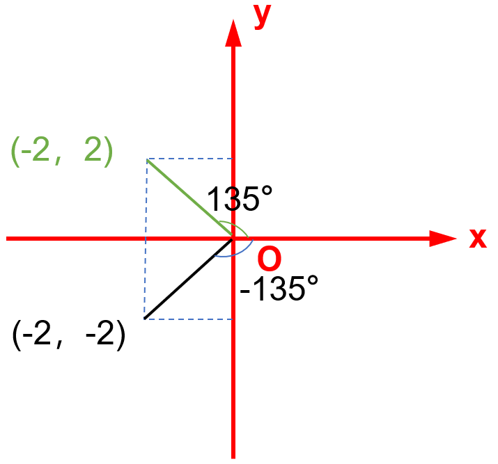 比如上图的点(-2,-2),与原点连接后与X轴的夹角是-135°;而(-2,2)对应的解是135°,这样就能更直观理解了。