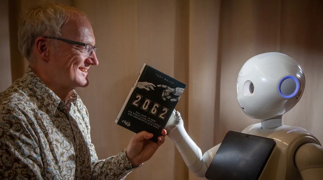 图注:Toby Walsh教授与他的书《2062: The World that AI Made》,这本书预测了人工智能将对工作、战争、政治、经济、人类日常生活以及人类死亡产生的影响