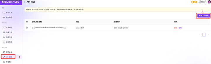 注册完成后,点击左侧的API密钥,然后点击右侧的新建API密钥