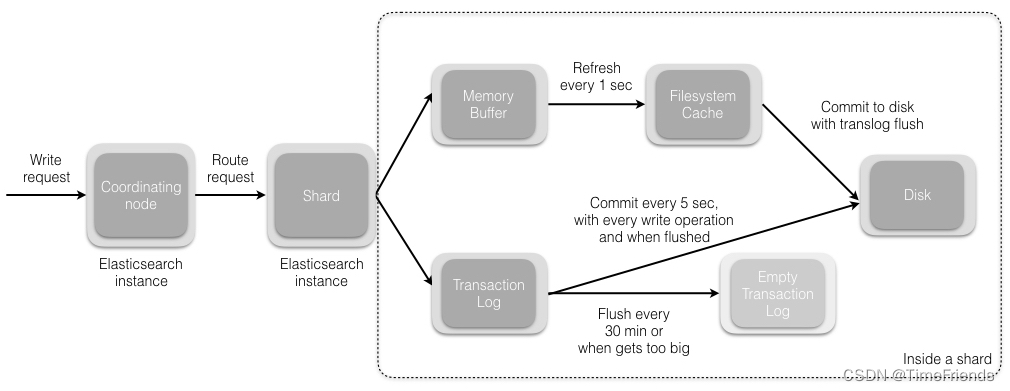 (2)由于 memory Buffer 和 Filesystem Cache 都是基于内存,假设服务器宕机,那么数据就会丢失,所以 ES 通过 translog 日志文件来保证数据的可靠性,在数据写入 memory buffer 的同时,将数据写入 translog 日志文件中,在机器宕机重启时,es 会自动读取 translog 日志文件中的数据,恢复到 memory buffer 和 Filesystem cache 中去。