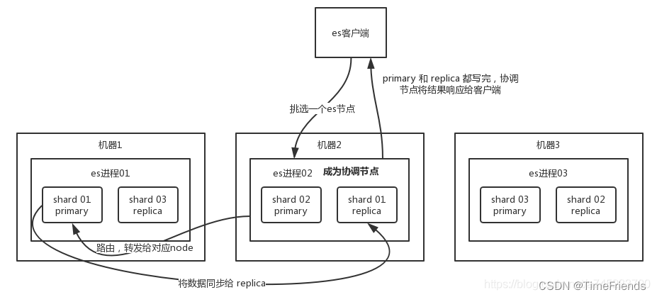 (3)对于读操作,可以设置 replication 为 sync(默认),这使得操作在主分片和副本分片都完成后才会返回;如果设置replication 为 async 时,也可以通过设置搜索请求参数_preference 为 primary 来查询主分片,确保文档是最新版本。