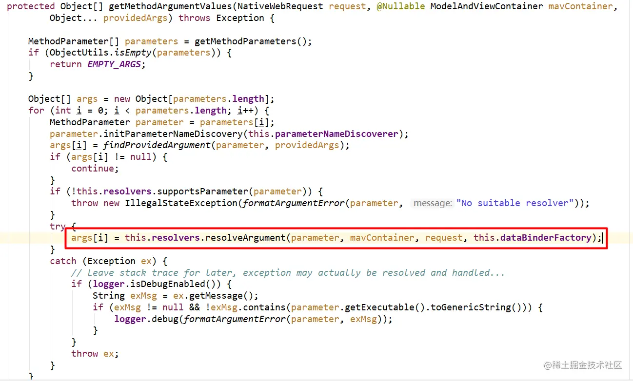 红色框、框柱的是获取一个参数解析器、如果最前面的解析器resolver.supportsParameter(parameter)返回的是true的情况下就使用当前解析器做为参数解析使用、所以我们自定义的解析器放在第一个的位置上就会优先使用自定义的。