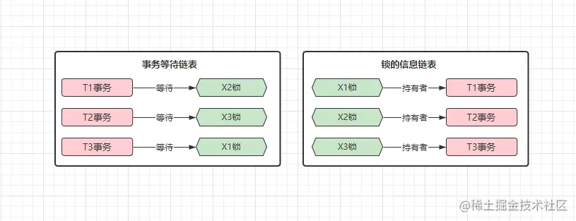 X2锁的持有者T2,再看看T2是否在阻塞等待获取其他锁。 - ④再在「事务等待链表」中查找