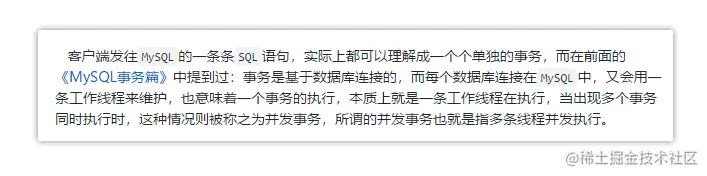 还记得咱们在《MySQL锁机制》这篇文章中,描述事务、连接、线程三者关系的那段话嘛?