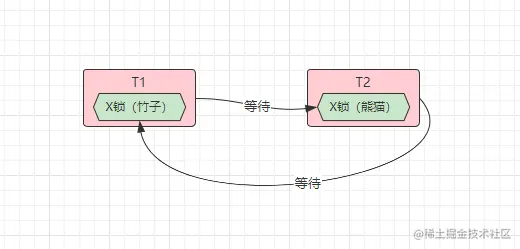 上面有一张很简单的账户表,因为只是为了演示效果,所以其中仅设计了用户名和余额两个字段,紧接着有T1、T2两个事务,T1中竹子向熊猫转账,而T2中则是熊猫向竹子转账,也就是一个相互转账的过程,此时来分析一下: