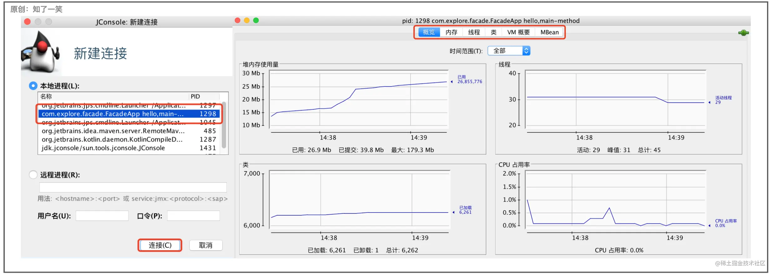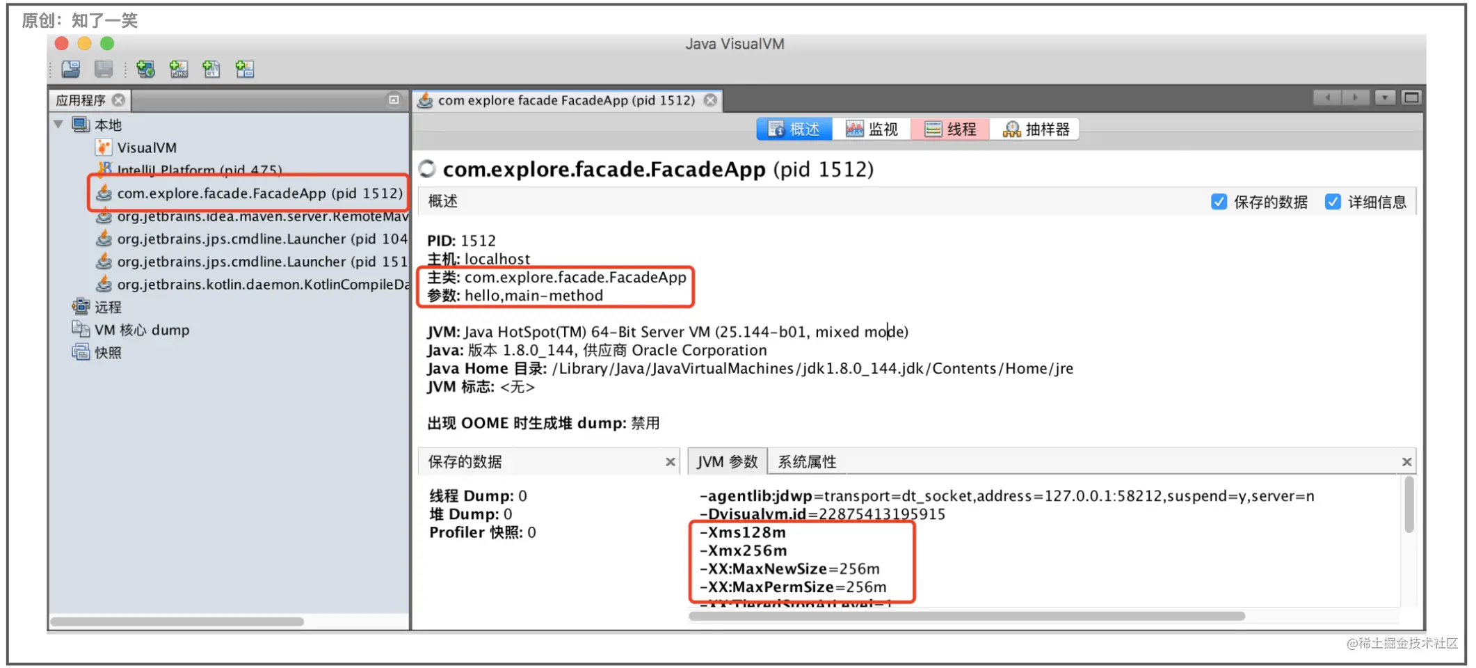 VisualVM作为解决JVM问题的常用工具,集成的功能丰富且强大,此处通过Idea插件的方式启动FacadeApp微服务,在进程主页可以看到自定义的配置,线程一栏因为检测到死锁直接给到异常提示;