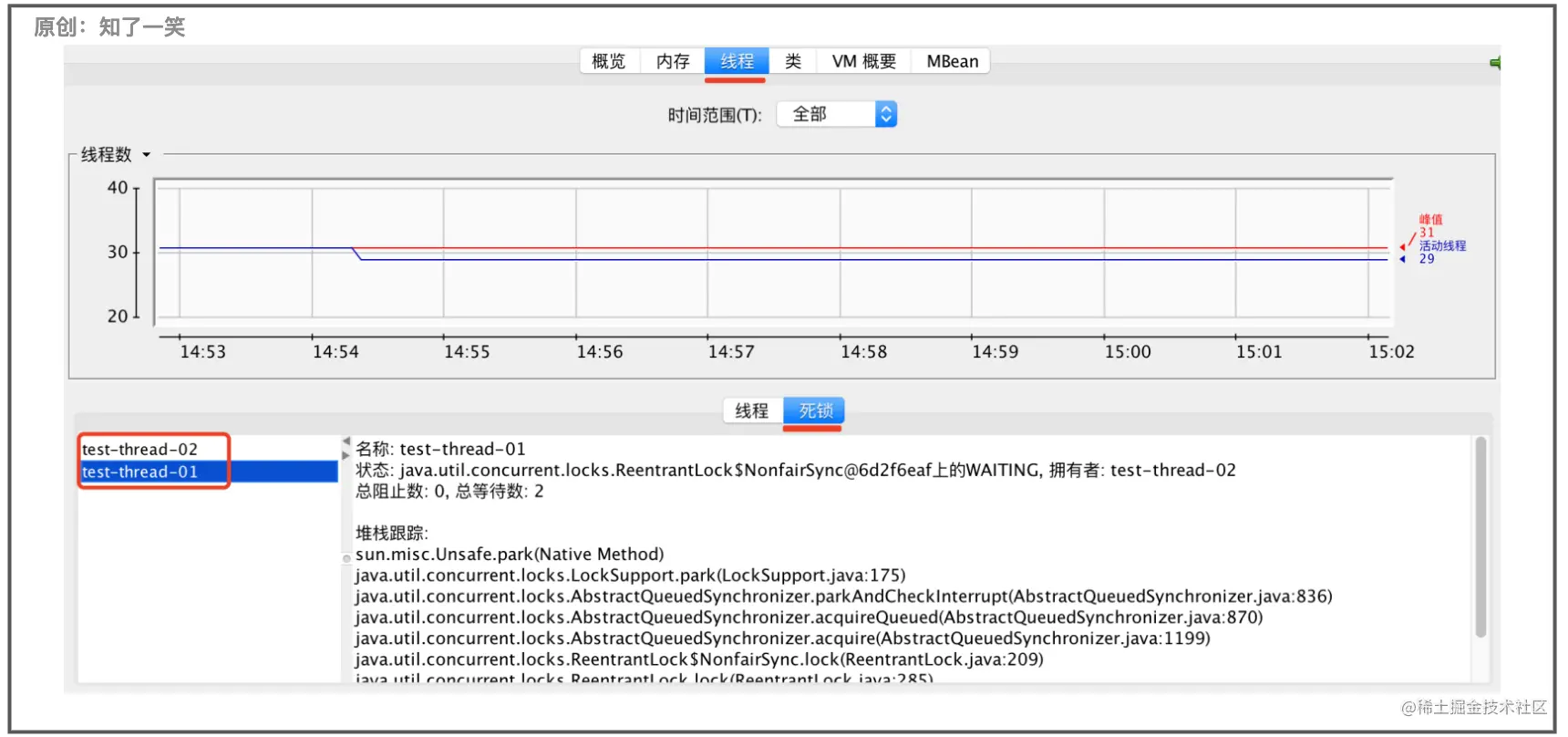 这里选择线程一栏,可以直观的看到线程数量的变化曲线,也可以在下方查看某个线程的具体信息,并且可以通过检测死锁功能,发现在服务中创建的test-thread-01和test-thread-02两条线程;