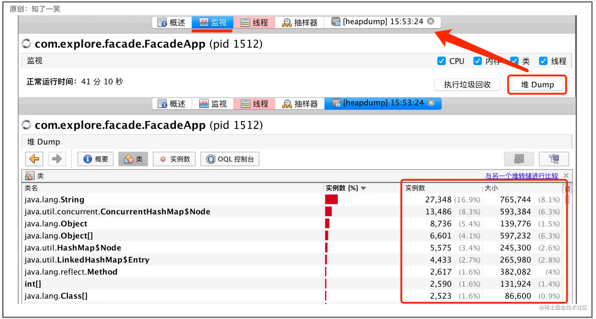 在监视一栏可以通过【堆dump】查看详细的信息,可以查看类的实例数和大小,并且完成了结果排序和占用统计;此处信息在定位和解决JVM问题时非常重要;