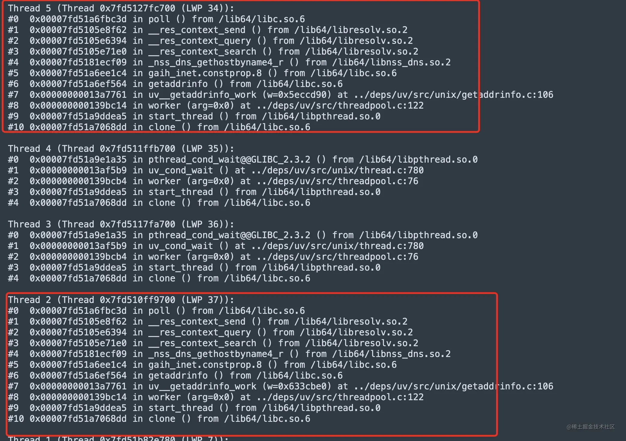 为了分析这个问题,特意修改了基础镜像,在镜像中安装了一个 gdb,用来调试 Node,在复现问题以后,我 attach 上去看了一下线程的 stack。