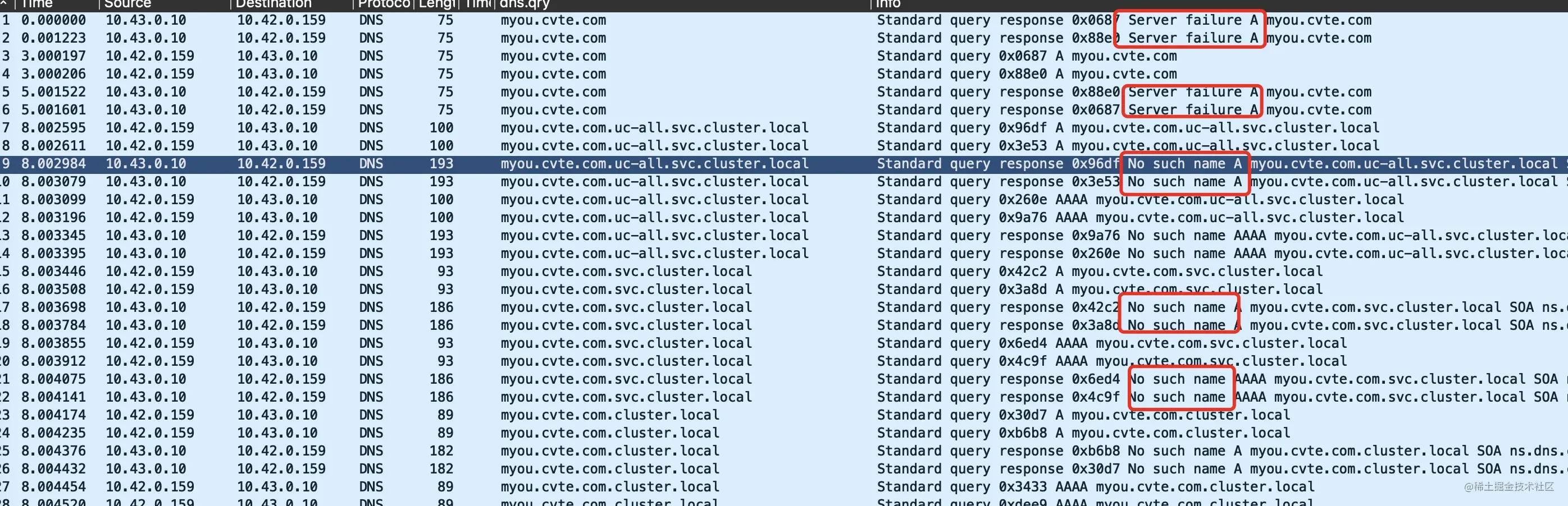通过 DNS 抓包,可以确认这个域名的 DNS 请求耗时非常久,而且一直没有返回正确的结果(要么 Nosuch name,要么 Server failure)。
