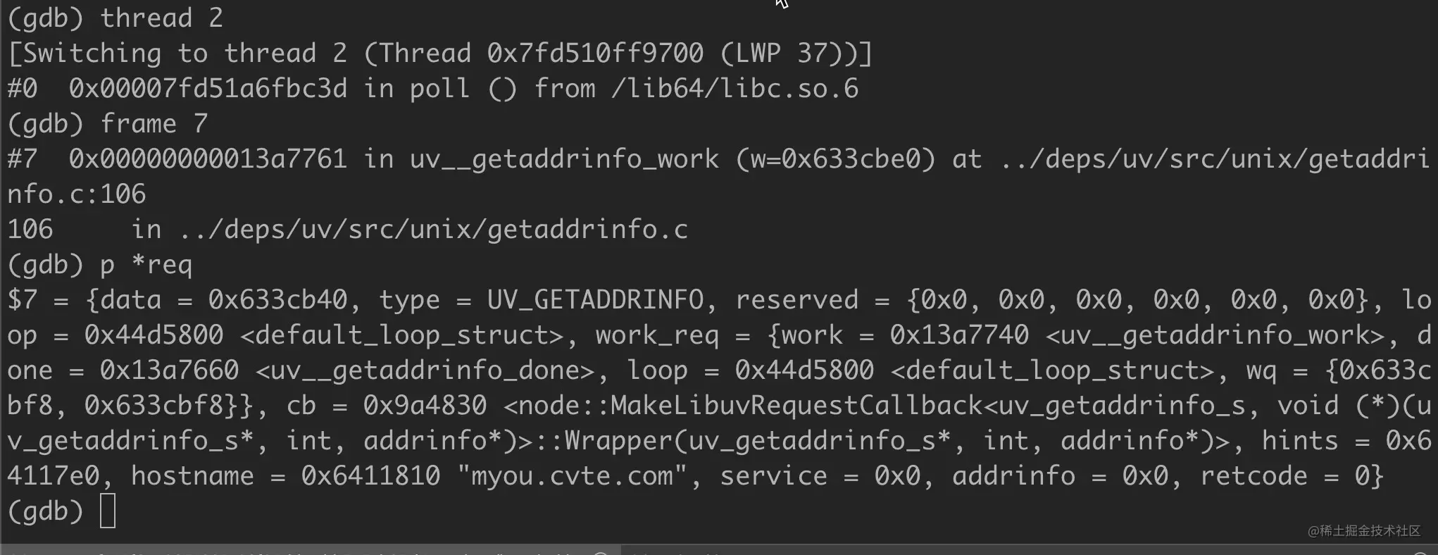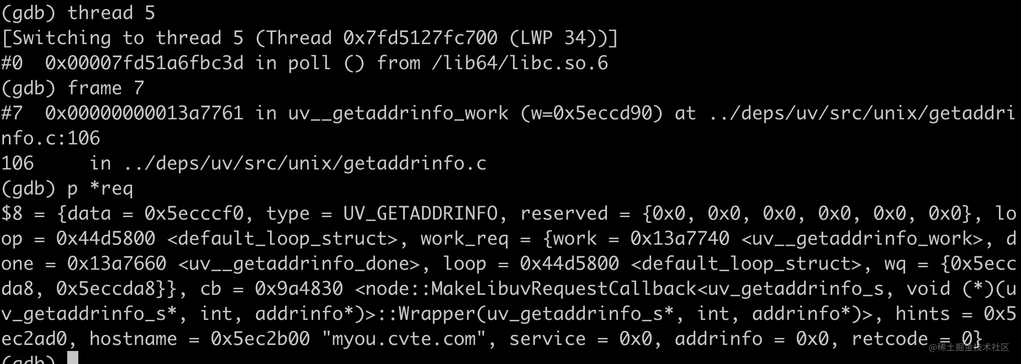 这里有一个 req 变量,我们就可以通过 p *req 查看这个 req 变量,它的类型为 uv_getaddrinfo_t,里面就有字段表示当前 DNS 请求的域名是什么,可以看到这里的域名不是我们的目标域名 seewo-xxx.uc-all,而是 myou.cvte.com,这个域名请求的哪里来的,我们后面来分析。