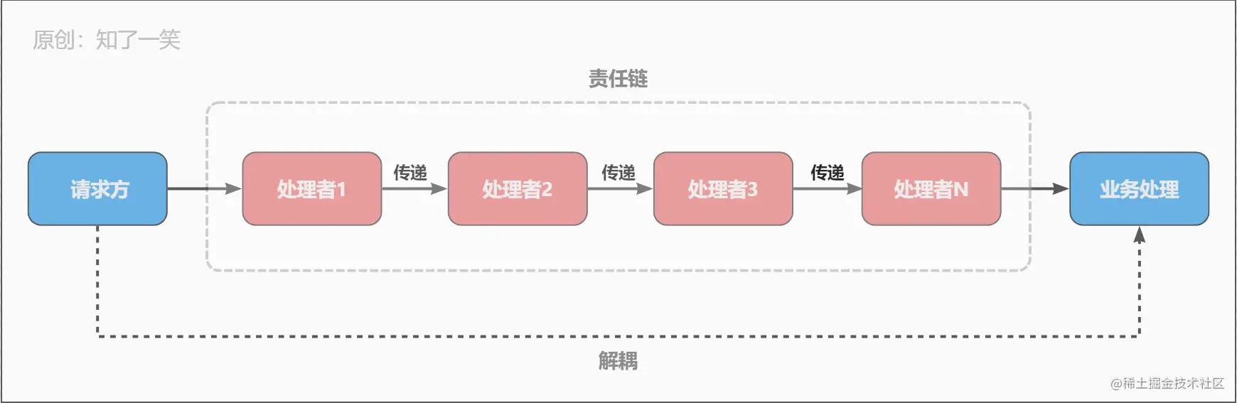 - 请求处理者(节点对象)只需要关注自己感兴趣的请求进行处理即可,对于不感兴趣的请求,转发给下一个节点。