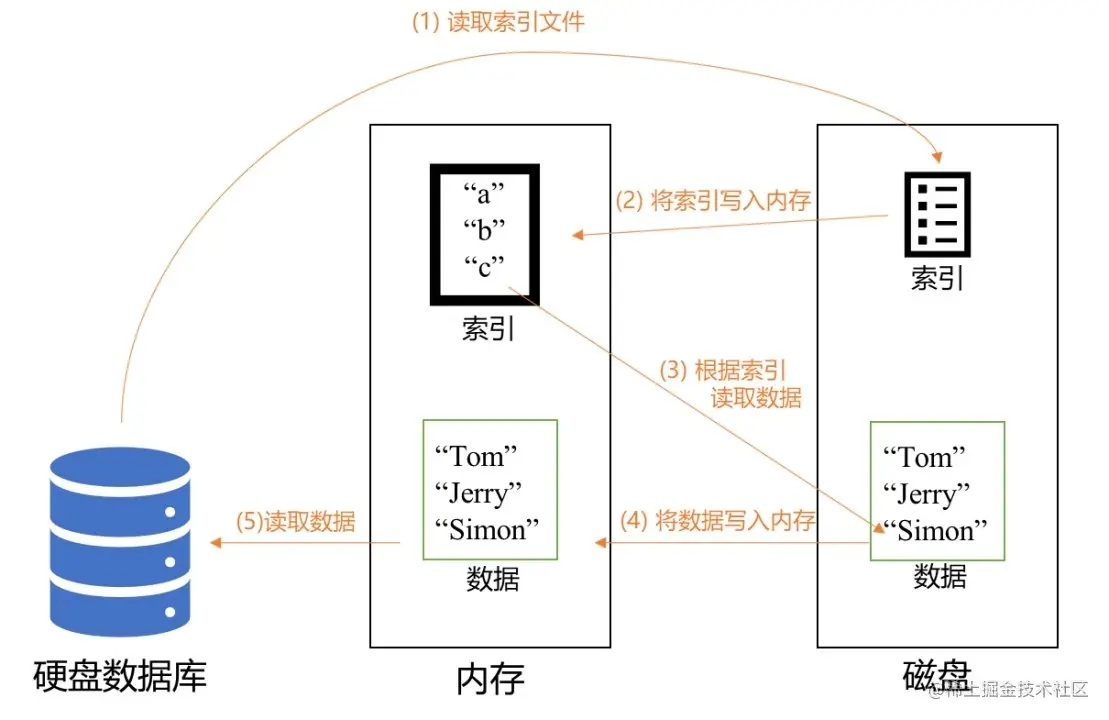 以MySQL为例,MySQL的数据和索引都是持久化保存在磁盘上的,因此当我们使用SQL语句执行一条查询命令时,如果目标数据库的索引还没被加载到内存中,那么首先要先把索引加载到内存,再通过若干寻址定位和磁盘I/O,把数据对应的磁盘块加载到内存中,最后再读取数据。