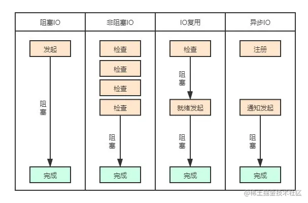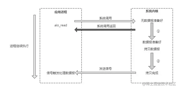 而异步IO则不一样,当进程发起IO操作之后,就直接返回,直到内核发送一个信号,告诉进程IO已完成,则在这整个过程中,进程完全没有被阻塞。