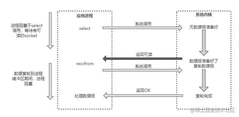 当用户进程调用了select,那么整个进程会被阻塞,而同时,内核会"监视"所有select负责的socket,当任何一个socket中的数据准备好了,select就会返回。这个时候用户进程再调用read操作,将数据从内核拷贝到用户进程。