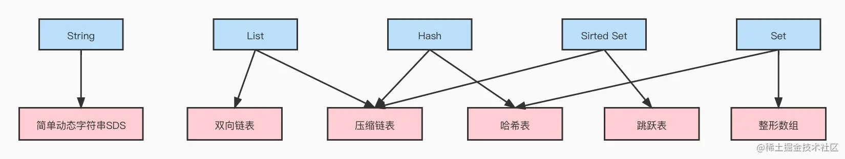 Redis 的底层数据结构一共有6种,分别是,简单动态字符串,双向链表,压缩列表,哈希表,跳表和整数数组,它们和数据类型的对应关系如下图所示: