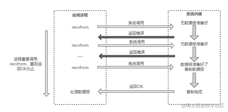 从图中可以看出,当用户进程发出 read 操作时,如果内核中的数据还没有准备好,那么它不会阻塞用户进程,而是立刻返回一个错误。