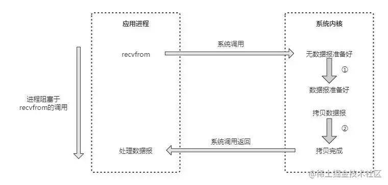 对于网络IO来说,很多时候数据在一开始还没到达时(比如还没有收到一个完整的TCP包),系统内核就要等待足够的数据到来。而在用户进程这边,整个进程会被阻塞。