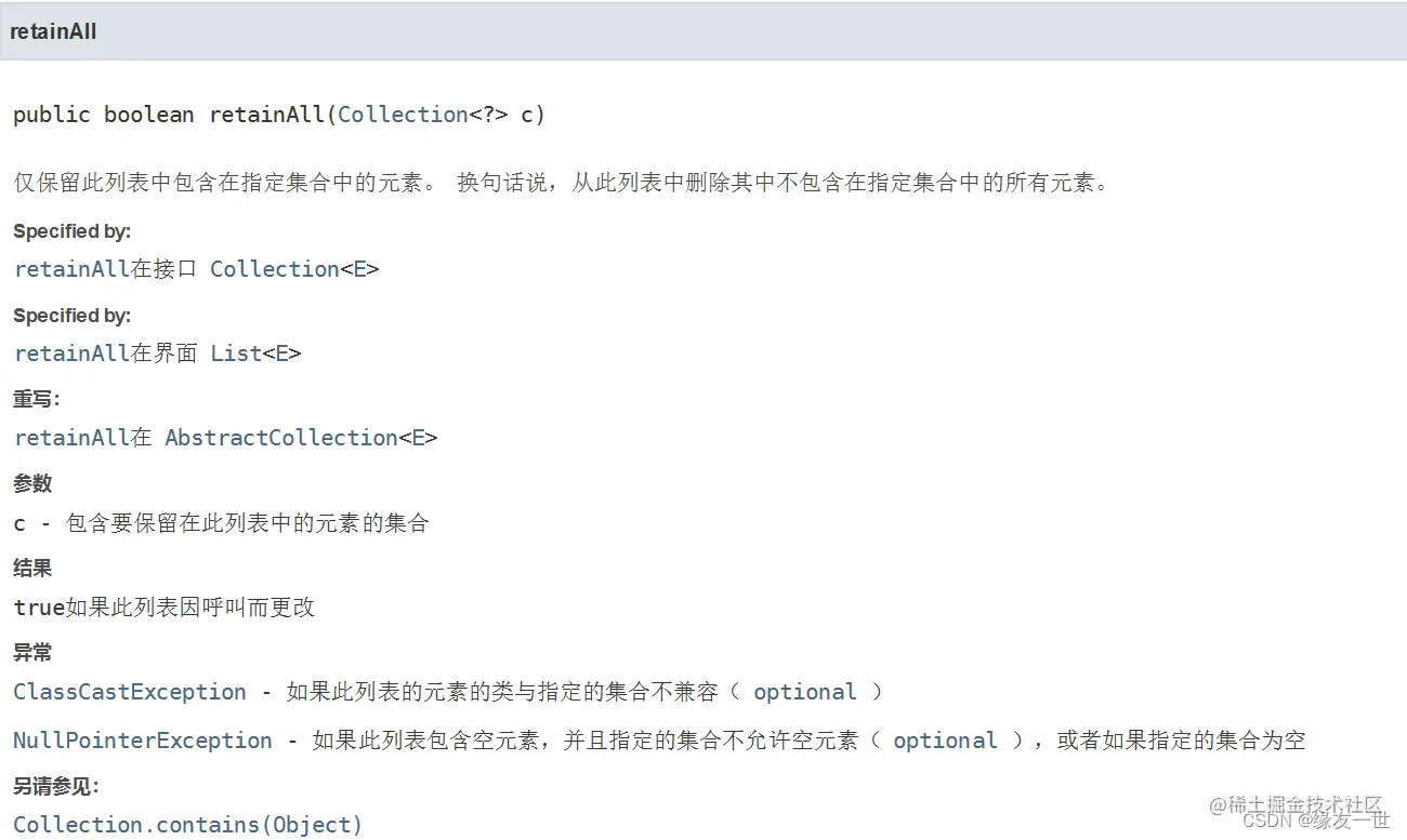 | boolean removeAll(Collection c) | 移除本容器和容器c中都包含的元素 |