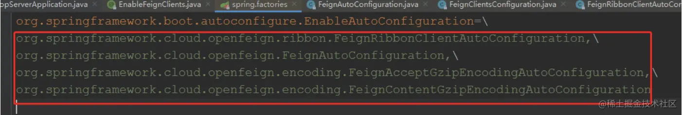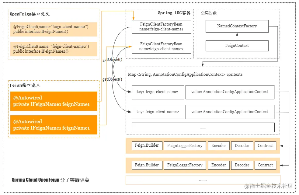 springboot启动时会加载类路径下/META-INF/spring.factories中key为org.springframework.boot.autoconfigure.EnableAutoConfiguration的类,FeignContext注册到容器是在FeignAutoConfiguration上完成的。FeignContext是全局唯一的上下文,它继承了NamedContextFactory,它是用来统一维护feign中各个feign客户端相互隔离的上下文。