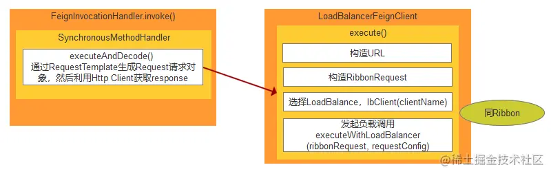 利用 JDK 提供的 HttpURLConnection 发起远程的 HTTP通讯。至此发起请求的流程就完成了。下面附上一张这个过程的流程图,对于Ribbon的调用过程请参考 :Ribbon 源码分析。